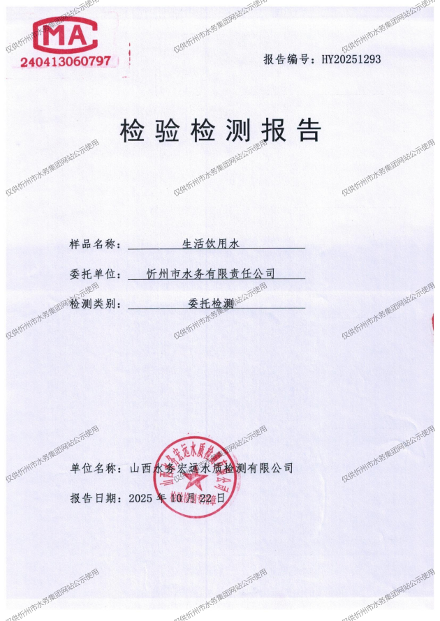忻州城區(qū)公共供水水源水、出廠水、管網(wǎng)水、管網(wǎng)末梢水2025年10月份水質(zhì)信息公示