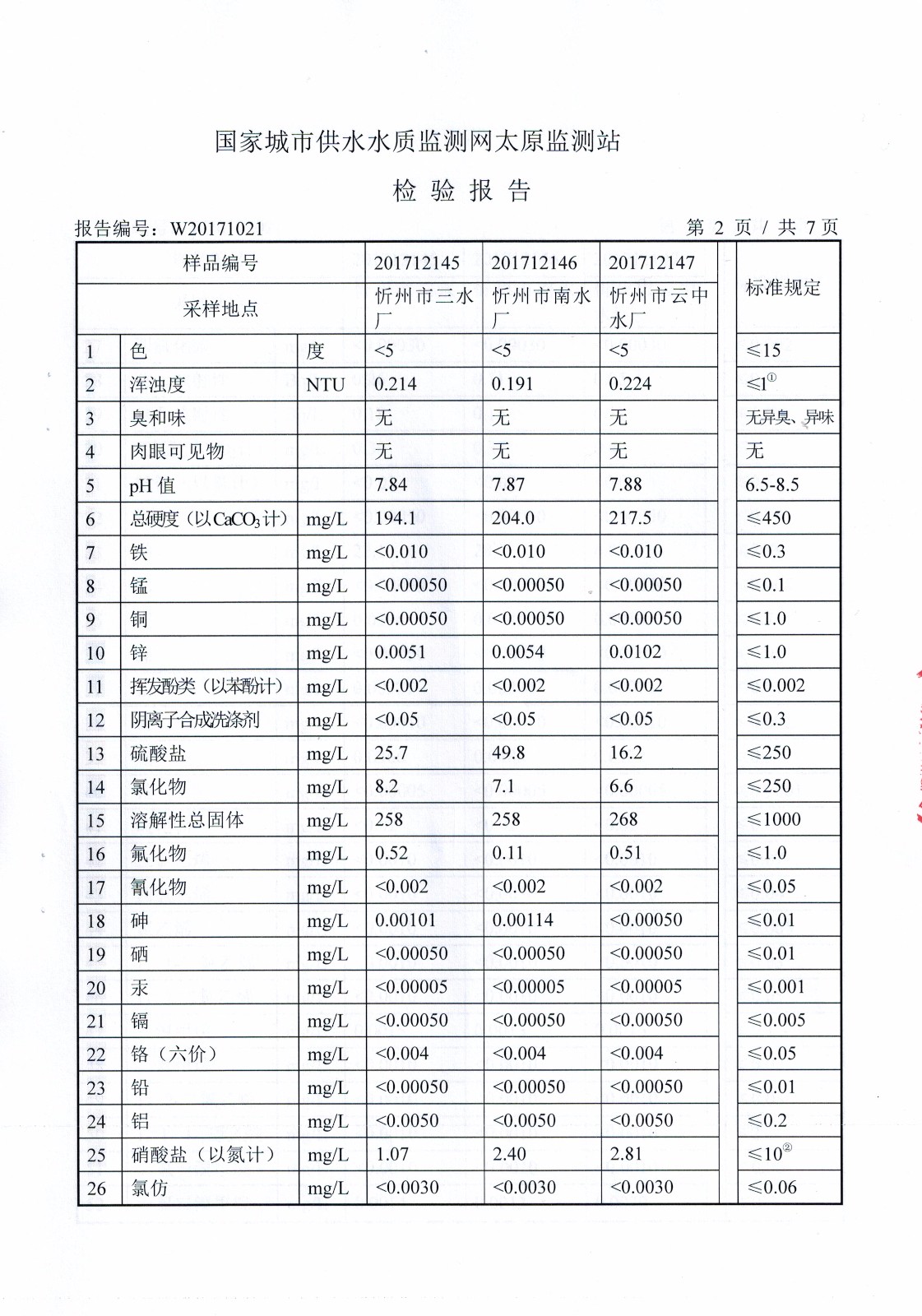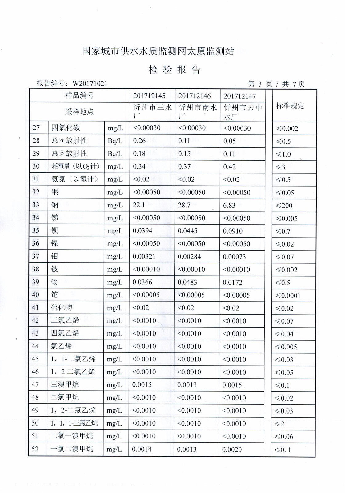 2017年忻州城區(qū)公共供水南水廠、三水廠、云中水廠出廠水106項水質(zhì)全分析