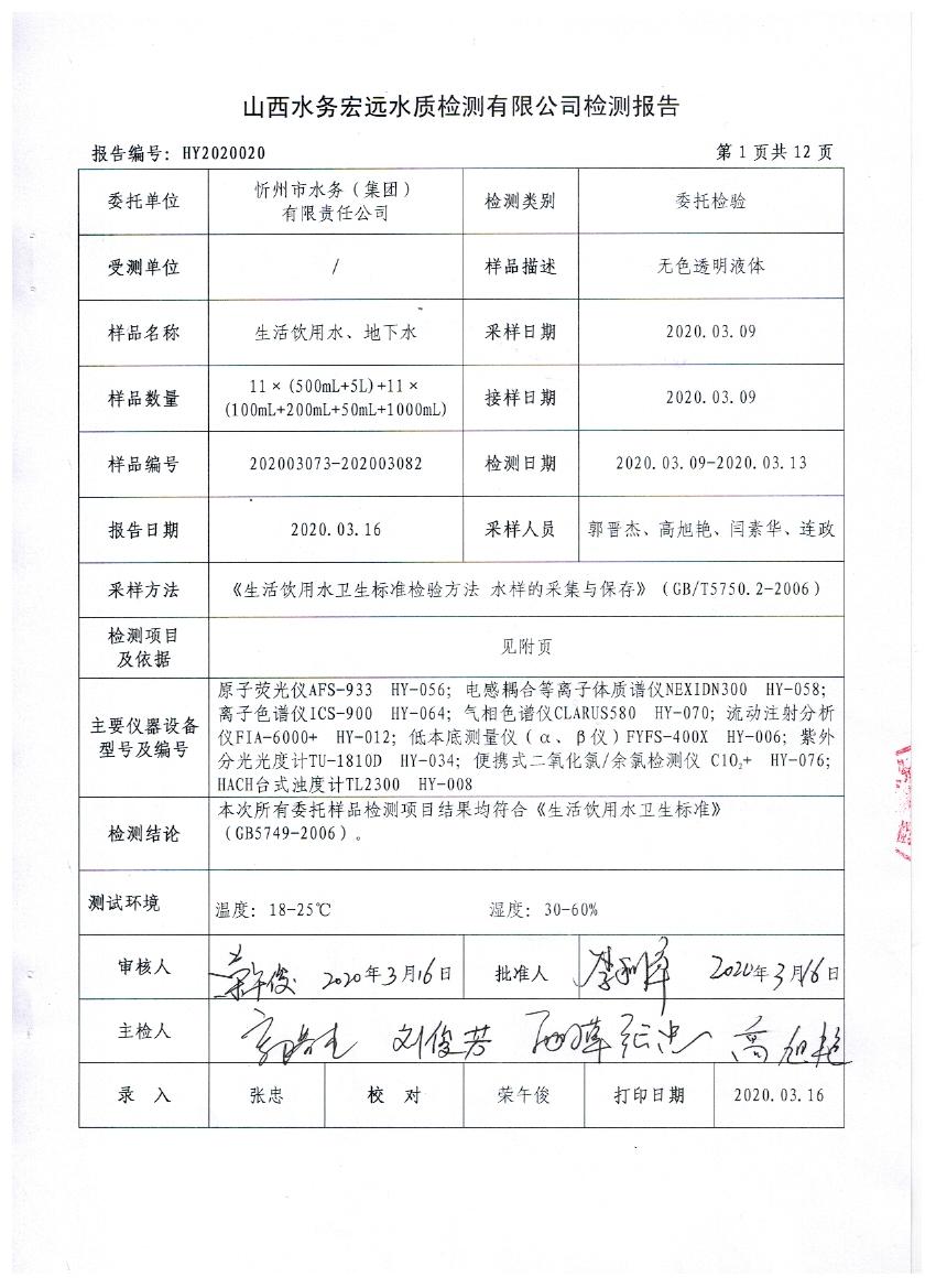 忻州城區(qū)公共供水水源水、出廠水、管網(wǎng)水、管網(wǎng)末梢水2020年3月份水質(zhì)信息公示