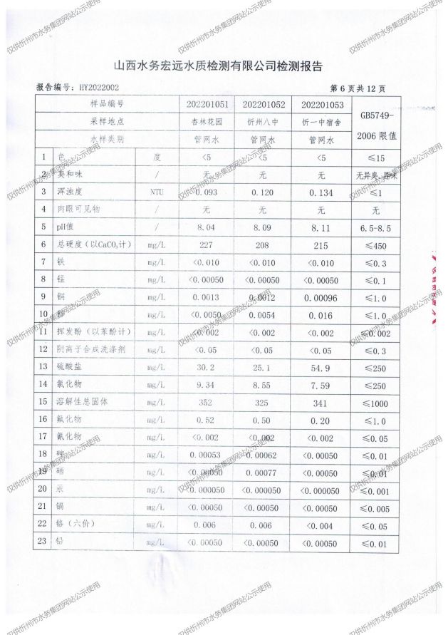 忻州城區(qū)公共供水水源水、出廠水、管網(wǎng)水、管網(wǎng)末梢水2022年1月份水質(zhì)信息公示