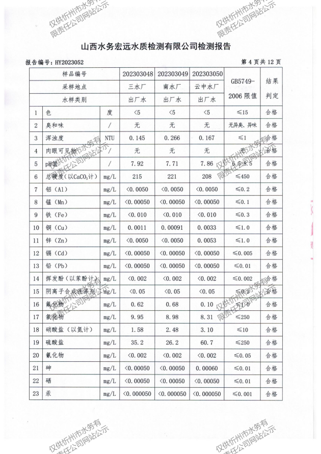 忻州城區(qū)公共供水水源水、出廠水、管網(wǎng)水、管網(wǎng)末梢水2023年3月份水質(zhì)信息公示