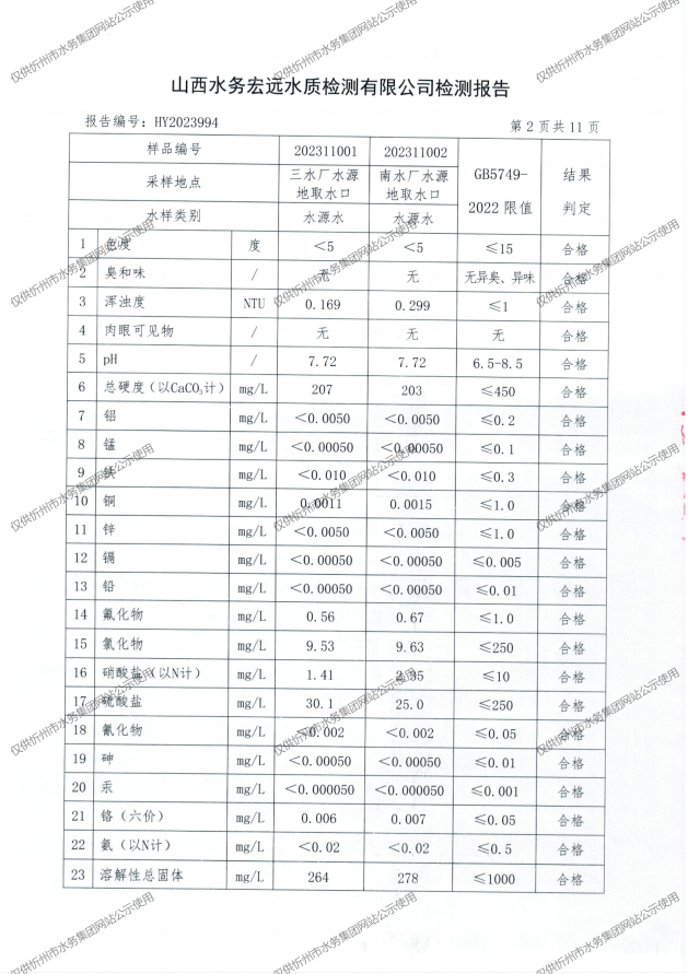忻州城區(qū)公共供水水源水、出廠水、管網(wǎng)水、管網(wǎng)末梢水2023年11月份水質信息公示